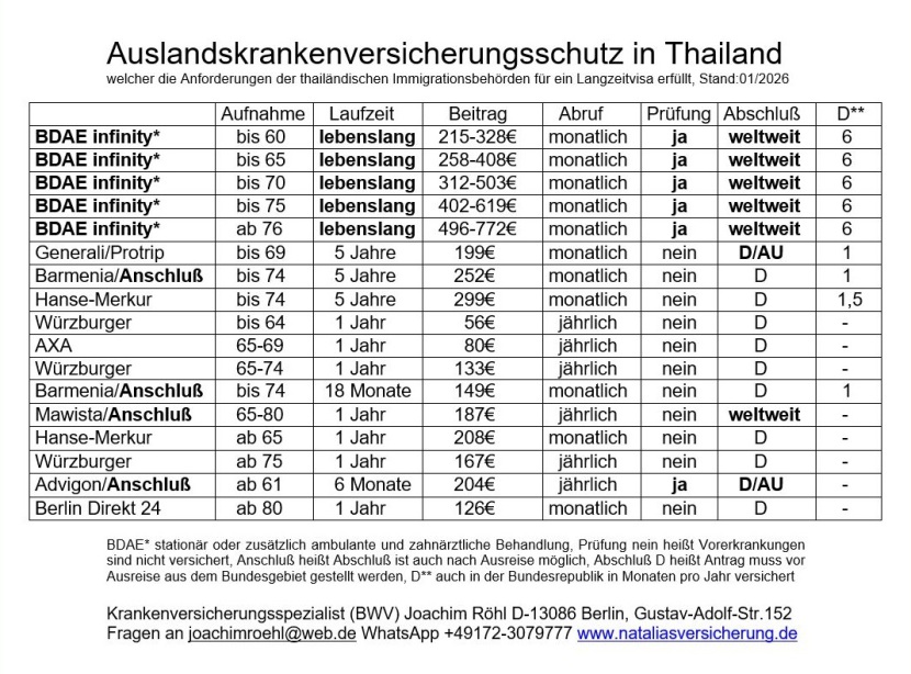 Tip: ambulante und zahnärztliche Behandlung kann für etwa hundert Euro zusätzlich mitversichert werden. Kinder und der thailändische Ehepartner sind mitversicherbar, wenn alle einen gemeinsamen Wohnsitz haben. Es ist ebenso möglich den Vertrag heute als Anwartschaftsversicherung zu beginnen und dann bis zehn Jahre später zu aktivieren.